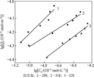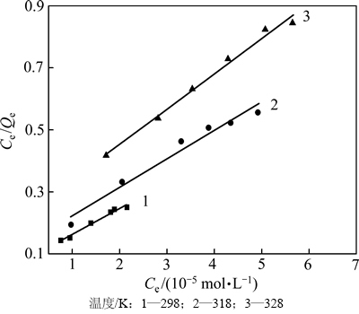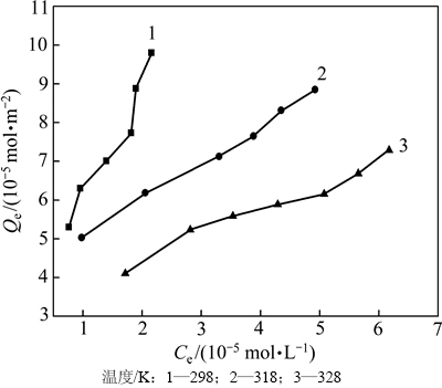 在吸附时间为12 h,pH 8.5左右,3种不同温度(298,318和328 K)下黄铜矿对DiPODECTU的平衡吸附量(Qe)与DiPODECTU的平衡浓度(Ce)的关系见图3。