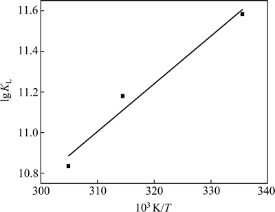 由图3可知:在同一温度下,随着DiPODECTU平衡浓度的增加,黄铜矿对DiPODECTU的平衡吸附量也增加;在相同的平衡浓度条件下,黄铜矿对DiPODECTU的平衡吸附量随温度的升高反而降低,表明该吸附过程为放热过程。