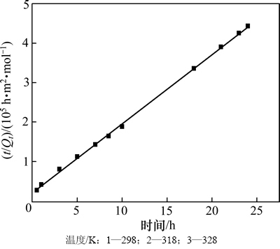 采用二级反应动力学方程[23](式(6))对DiPODECTU在黄铜矿表面的吸附过程(实验数据见图1)拟合,其t/Qt-t关系见图7。