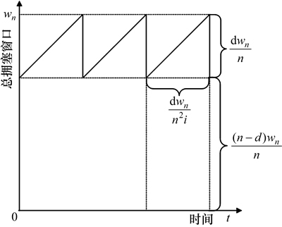 图5所示为n条TCP流的总拥塞窗口wn变化。其中:i和d分别为拥塞窗口的增窗因子和降窗因子,P为链路丢包率。若没有发生丢包,则在1个往返延时t内n条流共增长窗口ni。当发生误码导致丢包时,其中1条TCP流降低其拥塞窗口,另外n-1条流窗口不变,因此,总拥塞窗口变为(n-d)wn/n。丢包后,共花费dwn/(n2i)个往返延时t将总窗口恢复到wn。