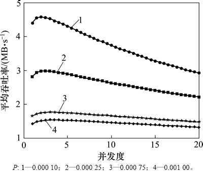 每条TCP流的平均吞吐率r见图6。从图6可见:丢包率越低,吞吐率越高;不论是哪种丢包率,当并发度n变化时,TCP流的吞吐率存在1个最高值。这说明存在1个最优的复用率,使得TCP流的传输效率最高。下面计算最优的并发TCP流数nopt。