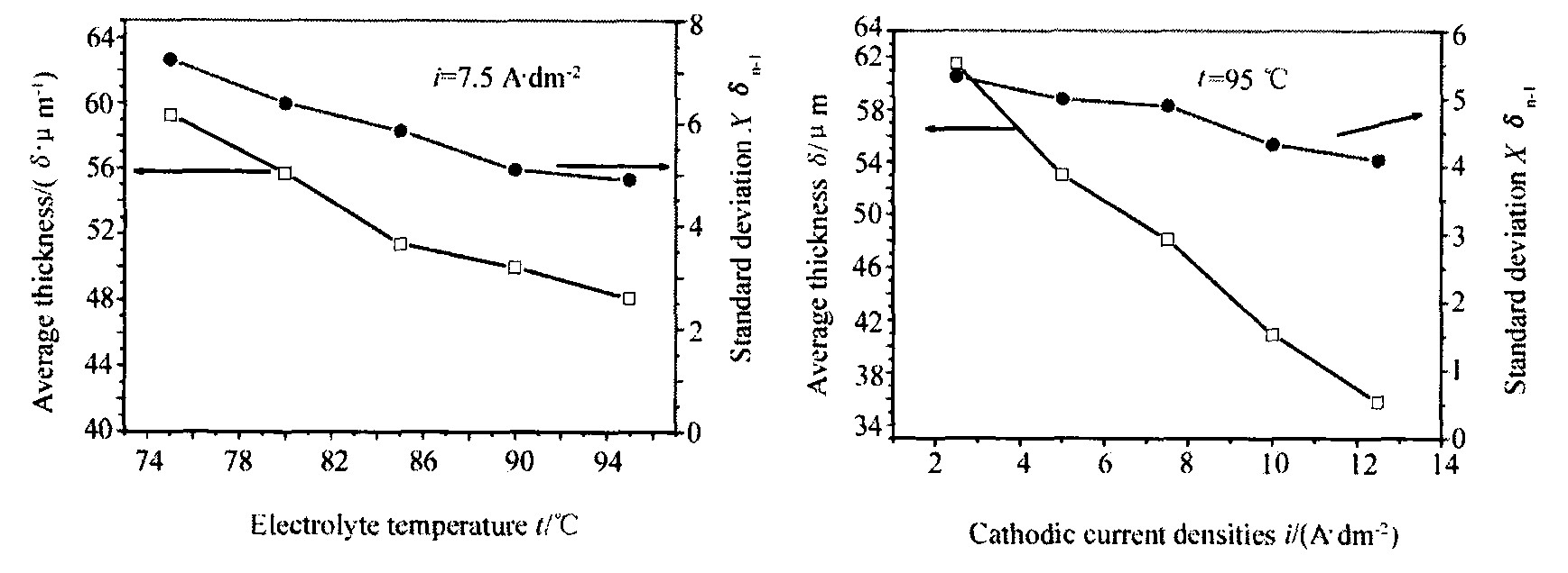 2. 根据贝塞尔公式, 用厚度的标准偏差值来衡量铁箔成型时的一致性, 结果表明随电解温度和阴极电流密度的提高, 电沉积铁箔的均匀程度均提高。