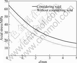 porosity along the notch line, where d is the distance from the surface to the center of the smallest cross section of the specimen. Fig.6 shows that the maximum axial stress arises at the notch root, but the maximum stress considering voids is larger than that without considering voids. Fig.7 shows that the maximum porosity also appears at the notch root of the specimen and agrees well with the experimental results.
