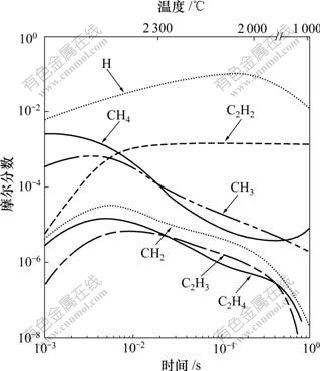 基本条件为:摩尔分数0.3% CH4-H2混和气体, 压力为2 666 Pa, 初始反应温度为2 600 K,该温度以1 400 K/s的速率线性下降
