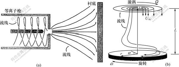 (a) 等离子枪/衬底的侧视图;(b) 反应器几何示意图(图中的系统用圆柱坐标来描述(r, φ, x))