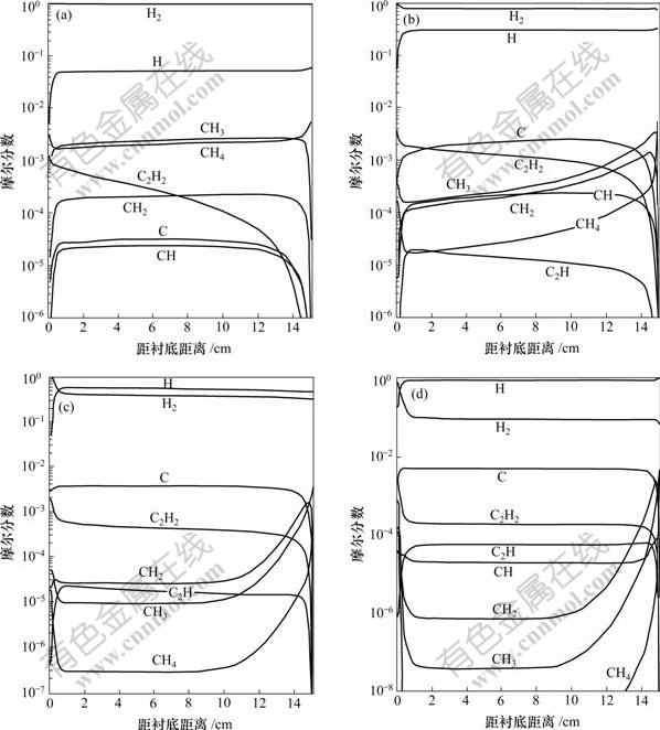 图3 入口温度为2 500 K、入口处甲烷浓度为0.5%及衬底温度为1 200 K时的气相组元分布[37]