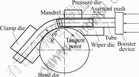 For NC bending process, the rotary draw bending method is used (shown in Fig.1). Pulled by bend die and clamp die, the tube goes past the tangent point and rotates along the groove of bend die to desired bending degree and bending radius; then the mandrel retracts and the tube is unloaded.