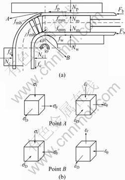 The field distribution with small bending takes on obvious 3D characteristics. Fig.2 shows that node A in the extrados is under tension stress in both tangent and hoop directions and compressive stress in radial direction, meanwhile node B in the intrados is under three-dimensional compressive stress states. According to the volume constancy rule of plastic deformation, the extrados nodes are under tangent tension strains, hoop and radial compressive strains. While the intrados nodes are under the states with tangent compressive strains, hoop and radial tension strains. Because the tube bending forming mainly depends on the tube material’s compression and elongation deformation, the tangent stress σθ and strain εθ on the compression (intrados) and elongation (extrados) regions are regarded as the maximum principle stress and strain. Due to the large relative tube diameter D/t, the normal stress can be neglected. So the plane-stress state is assumed.