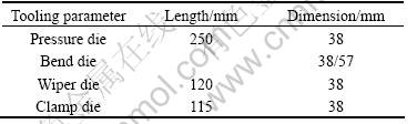 The experiment can study the bending process directly and verify the FE modeling. In the authors’s lab, the PLC controlled hydraulic tube bender W27YPC-63 is used with the same bending principle as the NC bender. The material is aluminum alloy LF2M and stainless steel (1Cr18Ni9Ti). Tube OD is 38 mm, wall thickness t is 1 mm, the length L is 600 mm and the bending radius R is 57 mm and 38 mm, respectively. The relative bending radius is 1.5D and 1.0D, which are regarded as the small bending conditions. The bending speed is 0.15 rad/s, and the pressure die’s pushing assistant speed is the same as the centerline tangent velocity of the bend die. For 1.5D and 1D bending radius, the pressure die linear speed is 8.55 mm/s and 5.7 mm/s, respectively. The bender is without boost device. The tooling parameters are shown in Table 1 and Table 2[14].