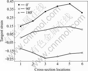 As shown in Fig.3, the six lengths in the tangent bending direction for six cross-sections are measured at 0?, 90? and 180? respectively and the tangent strains εθ are calculated by εθ=lg(1+Δl/l); Next, the hoop thickness at the fifth cross-section is measured by 45? intervals to obtain the normal strain εr by εr=lg(1+Δt/t).