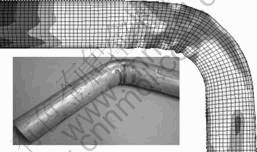 To verify the above results, a series of 1Cr18Ni9Ti tubes with 1D are bent between 30? and 150? in the experiment. The “stepped balls retraction” method is used and the step angle is 5?. Fig.23 shows the simulation and experimental results with bending angle 90?. It is seen that the instability does not occur in both simulation and experiment. That is because there is no relative slipping for tube/clamp die in practice with new method. So the problem for smaller bending-relative slipping of tube/clamp die is conquered. Additionally, the thinning and cross-section distortion degree are compared. The cross-section distortion degree is within 5% and the maximum thinning is within 29%. By comparison of the wall thickness at the extrados of the bent tube with 1D between FE simulation and experimental results, it is found that the maximum wall thinning degree is nearly the same between FE and experimental results.