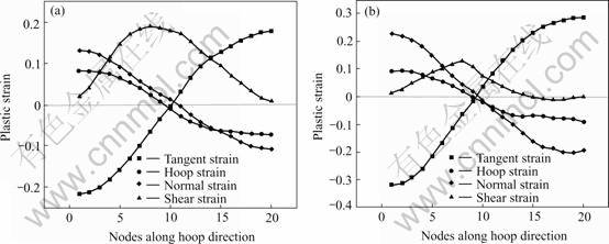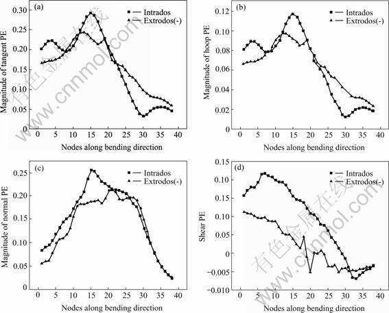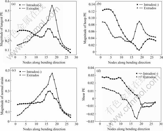 Fig.11 shows the plastic strain distributions of the tube along the bending direction. It is also shown that the strain distributions are non-uniform along the bending direction. It is shown that the maximum magnitudes of the tangent, hoop and normal plastic strains at the intrados are larger than those at the extrados generally, namely the deformation degree is larger than the materials at the intrados. Additionally, it is shown in Fig.11(b) that the magnitudes of the hoop plastic strains both at the intrados and extrados are much obvious, which confirms that the neglecting of the hoop strain of the tube is not reasonable for NC bending process in theoretical analysis[17]. Fig.11(d) shows that the shear strains at the crest lines of the tube is much minor compared with the tangent, hoop and normal strains. But from Fig.12, it is shown that the shear strains are large enough, especially at the nodes near the neural layer.