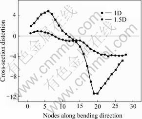 Because the deformation of nodes in the crest lines of both outside and inner side of the tube is the largest, these nodes can present the bending characteristics of the tube. Thus, the nodes along the both crest lines are selected to investigate the plastic deformation. Because the stress distribution of stainless steel tube is similar to the aluminum tube, the tube materials are aluminum alloy LF2M in the following without special declaration. Fig.8 shows the results with 1.5D and 1D. It is found that the wrinkling instability occurs with 1D bending conditions.
