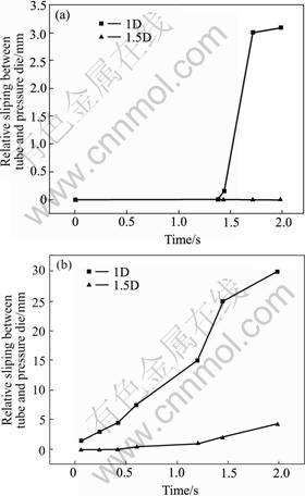Fig.19 Relative slip for tube/clamp die and tube/pressure die: (a) Between tube and clamp die; (b) Between tube and pressure die