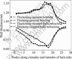 It is found that the balls retracting operation has little effect on the wall thickness change and it improves the cross-section distortion degree a little in the curved regions. Furthermore, it is observed that whether wrinkling occurs is not related with the retracting process [12]. Additionally, the unloading process only influences the tube accuracy. So in the study, the stress/strain analysis is only limited to the bending period and the wall thickness change and cross-section distortion are calculated based on the geometrical configuration after retracting and uploading.