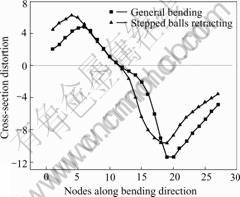 It is found that the RF of the bend die for “stepped balls retraction” increases step by step, which ensures no relative slipping between tube/clamp die shown in Fig.20(a). It is found that the new operation can realize the stepped local unloading, reduce the dragging force of mandrel greatly and then ensure no relative slipping between tube/clamp die, thus prevent wrinkling. Thus, the wrinkling does not occur with “stepped balls retraction” operation. Meanwhile, Fig.20(b) shows the relative slipping distance between tube/pressure die with new method is much smaller than the one under general bending conditions, which helps to make the materials into plastic bending regions and thus reduce over thinning degree shown in Fig.21. Fig.22 shows the cross-section distortion degree with “stepped balls retraction”. It is shown that the maximum cross-section distortion degree with “stepped balls retraction” is 10%, while for the general bending condition, it is 12%.