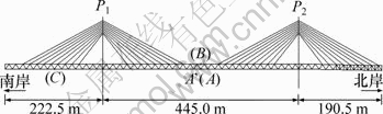 某公轨两用斜拉桥方案的跨径布置为222.5 m+445 m+190.5 m,双塔单索面,上层为4车道公路,下层为双线轻轨,主梁采用倒梯形断面的钢桁梁,桁架为三角形桁架,桁宽13 m,桁高12 m,节间长16 m。钢筋混凝土桥塔,塔高163.6 m,每个塔有9对索与主梁相连,构成扇形索面。图1所示为全桥有限元模型。二期恒载包括桥面铺装、栏杆、检修道、电缆支架和轨道结构等,主桥二期恒载约为201 kN/m。钢桁梁(指除索和塔之外的钢结构部分)自重约为173.8 kN/m,二期恒载与钢桁梁自重的比值为1.16。