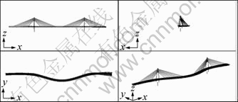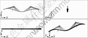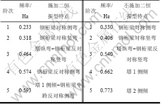 从计算结果可以看出:一阶侧弯的振型先于一阶竖弯出现,说明桥梁的面外刚度要弱于面内刚度;由于钢桁梁与主塔之间采用了刚度系数很大的弹性连接,因此,没有出现频率较低的体系纵飘振型;将两种模型的计算结果进行对比后发现,如施加二期恒载,结构的自振频率下降幅度较大,说明二期恒载对结构体系本身影响明显。