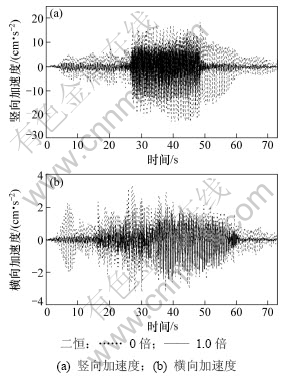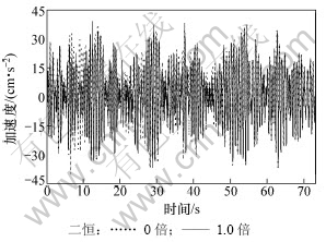 Fig.5 Time history cures of node B’s acceleration at left upper chord in middle span of bridge