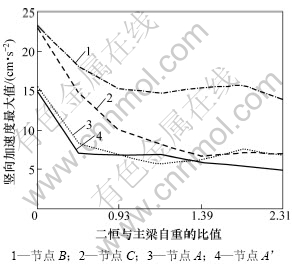 图8 不同节点的竖向加速度最大值随二恒与主梁自重比值的变化