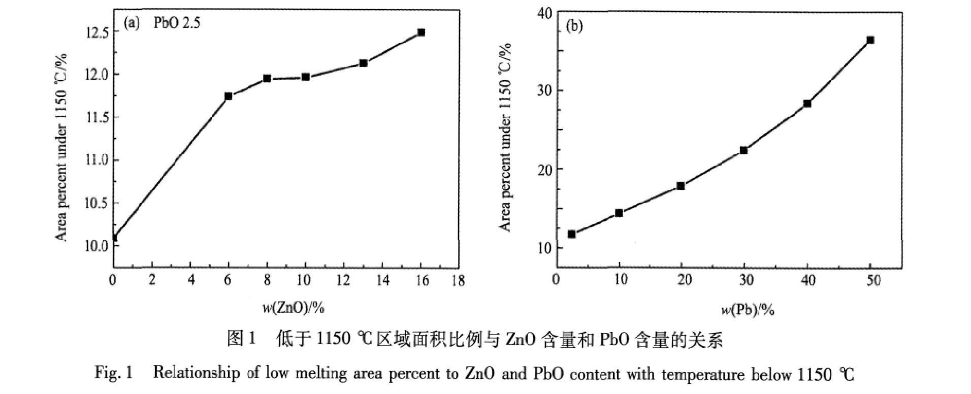 将五元渣系中Pb质量分数固定在终渣含铅量2.5%(质量分数), 而ZnO含量范围取0~16%, 通过FactSage计算了不同ZnO质量分数的PbO(2.5)-FeO-CaO-SiO2 -ZnO系五元液相图; 此外, 还依据还原过程变化, 计算了不同PbO含量下渣系的液相图; 理论计算得出, 随着还原过程的进行, 当(w (Pb))从50%减小到2.5%时, 低于1150 ℃且适合于铅冶炼的炉渣范围为: w (CaO)/w (SiO2 )为0.35~0.54, w (FeO)/w (SiO2 )为1.2~1.8。 绘制了ZnO含量和PbO含量对低于1150 ℃区域面积所占百分比的影响曲线(见图1)。 由图1(a)可见, 当w (ZnO)为0~8%时, 低于1150 ℃熔点区域增加迅速, w (ZnO)在8%~13%, 增加趋势变缓慢, 当w (ZnO)在13%~16%, 增加速率又加快。 由图1(b)可以得出: w (PbO)从50%变化到2.5%的过程中, 低于1150 ℃的熔点区域逐渐减小, 说明PbO含量在液态高铅渣还原过程中对炉渣熔点影响较大, 这是由于随着还原过程进行, 液态高铅渣中硅酸铅、 氧化铅逐渐被还原, 会有一小部分的2CaO·SiO2 等高熔点的物质析出而造成熔点逐渐升高的缘故。