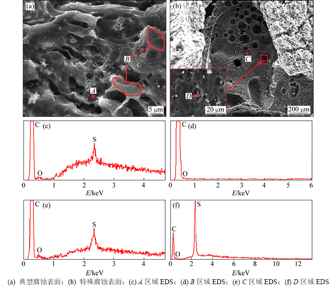 图2所示为DC2腐蚀区域的SEM像和EDS谱。为探究S催化焦空气反应性的作用机理,实验结合SEM和EDS对反应后DC2试样表面的典型腐蚀区(图2(a))和特殊腐蚀区(图2(b))进行了检测。检测发现,在试样的典型腐蚀区域中,半数左右的类似于A区的腐蚀坑槽中都能观测到一种S元素聚集的现象(图2(c));而在类似于B区的腐蚀残留区域里则完全无法检测到S元素的存在(图2(d))。图2(b)所示为检测过程中发现的一种较为特殊的腐蚀形貌,这类形貌在试样表面上只观测到了两处,该区域表面上出现了大量的直径在50~100 μm间不等的腐蚀坑。EDS分析结果表明:这些坑的底部区域也同样富集着一定量的S元素(C区,图2(e))。值得注意的是,当对腐蚀坑的底部进行放大观测时发现,坑底部的小型凹陷中黏附着一种细小的白色物质(如图2(b)),该物质中只含有C和S 2种元素,而且能谱中S特征峰的背底很小,在碳衬底的干扰下其摩尔数分数检测结果仍达到了11%(图2(f)),考虑到常温下并不存在任何固态的C和S化合物,该白色物质应该就是单质硫。