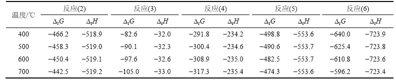 Table 3 △rG and △rH of reactions (2)-(6) between 400 and 700 ℃ kJ/mol
