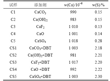 石油焦中的S主要以噻吩类有机硫的形态存在,同时也伴随着少量的硫酸盐类无机硫[11]。实验选择了二苯并噻吩(DBT)作为有机硫添加剂,并选择了不含有害金属杂质的(NH4)2SO4和稀H2SO4作为无机硫添加剂,含钙添加剂则包括CaCO3,Ca(OH)2,CaF2,CaO和CaSO4(统称为CaX)。以上试剂中稀H2SO4的质量分数为30%,其他均为分析纯试剂。