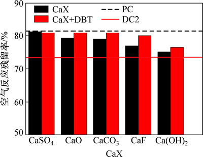 对表4中各试样进行空气反应性检测,结果如图3所示。图中虚线和实线分别表示PC和DC2试样的空气反应残留率。由图3可知:除CaSO4外,其他CaX带入的Ca均对焦的空气反应性表现出了不同程度的催化作用,不过与S的催化强度相比,Ca的催化性相对较弱。当含Ca沥青焦中添加了有机S之后,除了掺CaSO4沥青焦的反应残留率基本未变之外,其他各含Ca沥青焦试样的反应性均得到了不同程度的改善,显然,S对Ca的催化性产生了一种抑制作用;而与此同时,与DC2对比可发现,各添加了CaX和DBT的沥青焦试样中,Ca的存在也同样对S的催化性表现出了一种很强的抑制效果,而且可以注意到,不同CaX对S的抑制效果还会有所不同。根据Ca与S的这种相互抑制关系推测,它们在沥青焦中很有可能是发生了某种特殊的作用关系并最终直接或间接的因此而失去了自身的空气反应催化能力。