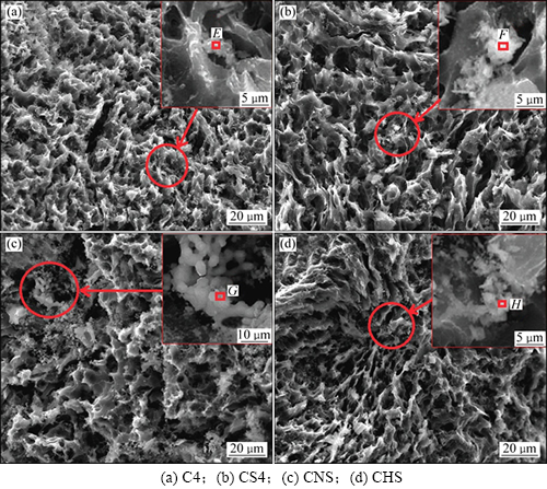 为对以上推测进行进一步确认,实验对空气反应后的C4,CS4,CNS 和CHS等试样进行了SEM和EDS检测,图4所示为各试样反应后的断面端SEM检测结果。图中E,F,G和H等区域的元素组成(EDS)如表6所示。由图4可见:反应后各试样的表面均出现了大量的白色物质,而且检测过程中发现,样品表面的腐蚀程度越高,这些白色物质的数量也会越多。实验对各试样中多个区域的白色物质进行了EDS分析,结果发现,排除明显的杂质后,C4中白色物质的元素组成基本都与E区域相似,它们均只含有C,O和Ca 3种元素,O与Ca摩尔数比主要为1.3左右,其范围不会超出1~3之间,由于C和O属于轻元素以及沥青焦C衬底的干扰,EDS无法对C和O元素进行精确的定量分析,但根据试样的元素环境推测,该白色物质极有可能是CaO和CaCO3的混合物;而CS4,CNS和CHS中白色物质的元素组成则基本相同,如:F,G和H等区域的EDS检测结果所示,它们中含有C,O,Ca和S 4种元素,且Ca与S摩尔数比为1左右。考虑到在焦的空气反应条件下Ca(HSO4)2,CaSO3,CaS和CaS2O3等含Ca和S化合物都不具备稳定性,CS4,CNS 和CHS中白色物质的主要成分只有可能是CaSO4。