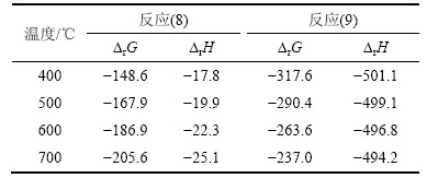 Table 7 △rG和△rH of reaction (8) and (9) between 400 and 700 ℃ kJ/mol