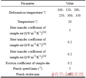 为应变速率,Q为变形激活能,σ为流变应力,n为应力指数,T为绝对温度,R为摩尔气体常数。参照王忠堂等[13]对AZ31镁合金本构关系的研究成果,式中Q取252 kJ/mol,n取9.13,R值为8.314 J/(mol·K);A和α为与材料有关的常数,其值分别取5.718×1020和0.008[13]。为了解不同温度对变形过程的影响,在Deform-3D 中建立分析模型时同时选择热传递和变形两种分析模式,所采用的热挤压工艺参数如表1所列。