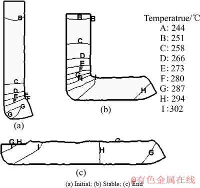 取变形体的轴截面进行分析以了解变形过程中的温度变化情况,其不同变形阶段的温度场分布如图2所示。由图2(a)可知,试样上部的温度在变形初期变化不大,而下部剪切变形区明显升高,导致变形区温度急剧升高的变形热一部分来自塑性变形能转化的热量,另一部分来自于工件与模具间的摩擦。图2(b)所示为试样变形中间阶段(冲头压下量50%)工件轴截面上的温度场分布,此阶段为挤压变形的稳定阶段,工件挤压力变化不大,变形在稳定的状态下持续进行,观察此阶段的温度场分布不难看出,变形主要集中在转角区域,该区域是整个试样中的最高温度区;与变形开始相比,此时高温区域的面积有所下降,这是因为随着变形进行,工件的剪切变形区趋于稳定,同时变形区的热量向其它区域传递,所以整个温度场呈现以拐角变形区为最高点,同时向两侧递减的趋势。图2(c)所示为变形结束时的温度场分布,不难看出,变形结束后,工件的温度场分布基本均匀;与变形前相比,此时温度有明显的提高。同变形前的温度场相比,变形后的温度区域更为均匀。随着工件与模具以及环境间热交换的持续进行,整个变形区的温度由左向右逐渐降低。剪切变形区温度在ECAP挤压过程中始终处于高温状态,成为决定挤压制品的最终组织和力学性能的关键因素。