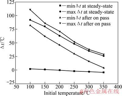 为了解不同初始温度下ECAP挤压过程中温度的变化情况,选取初始温度分别为100、150、200、250、300和350 ℃时ECAP稳定变形阶段和变形结束时段的温度分布与初始温度比较。挤压的峰值温升和最低温升情况如图3所示。由图3可知,当初始温度不同时,ECAP变形过程中的温度变化差别明显,总体来看,随着初始温度的升高,温升幅度逐渐降低,在变形稳定阶段,材料的最低温升差别不大,而最高温升随着初始变形温度的升高逐渐降低。在变形结束阶段,当初始变形温度为100 ℃时,变形所导致的最高温升为110 ℃,最低温升也达到82 ℃;而在同样的变形条件下,变形温度提高到300 ℃时,变形结束时,其峰值温升仅为29 ℃,最低温升为4 ℃;这表明随着初始变形温度的升高,变形对温度的影响逐渐降低。PEI等[15]利用二维有限元对Al-1%Mg等通道挤压中的试样中心温度变化进行模拟,而YAMAGUCHI等[16]则通过Chromel-Alumel热电偶测得试样中心位置在ECAP挤压过程中的实时温升在40 ℃左右且不同的铝镁合金材料差别不大,本研究在同等条件下的模拟结果与他们的结果吻合,表明本研究的模拟结果可信。