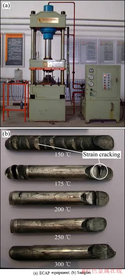 图4 AZ31镁合金的ECAP挤压实验装置及不同温度一道次变形后的外观形貌