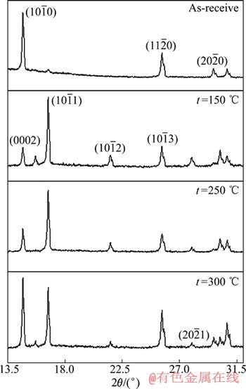 图5所示为原始试样及不同变形温度下挤压件横截面的XRD谱。由图5可见,原始试样的衍射最强锋为{10