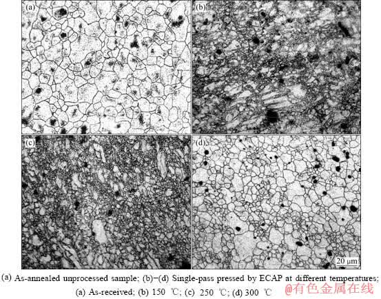 图6 AZ31镁合金未变形及不同变形温度ECAP一道次加工后试样横截面上的光学显微组织