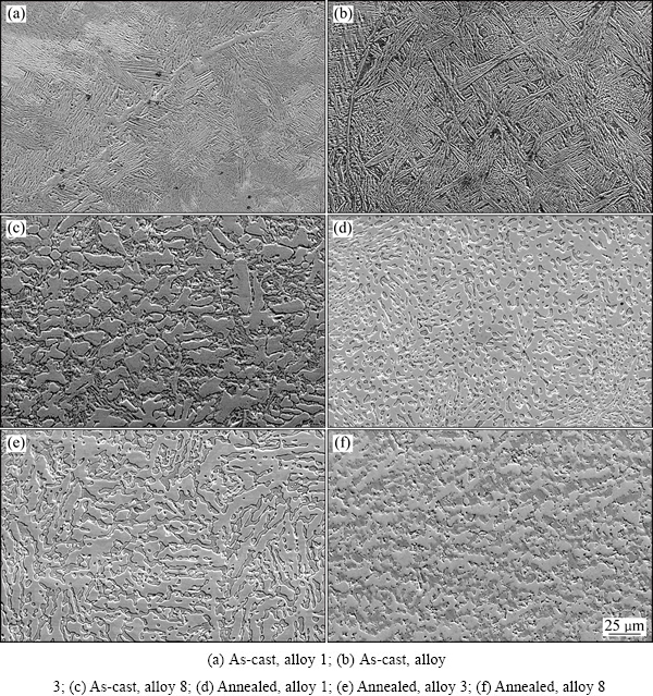 图1所示为不同硅含量合金在铸态和退火态下的典型组织。铸态组织形貌皆由针状组织交织混合而成(见图1(a)和(b)),其结果与CARTER等[9]获得的Fe-30Mo合金的铸态组织形貌类似,为魏氏体组织。合金在凝固过程中先形成了铁基固溶体基体相α-Fe (Mo,Cr,Ni),然后再析出Laves相,这一过程与BECHTOLDT等[10]的研究结果类似。而当Si含量从1.25%增加到2%(质量分数)时,魏氏体组织消失,出现富Mo的枝晶组织,与α-Fe (Mo,Cr,Ni)基体相间出现明显的晶界,富Mo的Laves相比例显著增加。而含3.00%Si的合金7中出现规则的细小层状组织,可能是共晶形式协同生长而成的FCC+Laves相,这种组织在Fe-Mo-Si合金也出现过[11]。含4.00%Si的合金8中出现了发达的富Mo枝晶组织。经过1150 ℃下均匀化退火9 h的合金中,组织变得较为均匀,主要为Laves相与基体相α-Fe (Mo, Cr, Ni)。