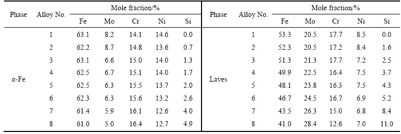 1) Si的加入改变了合金组织的形态和成分。随Si含量的增加,合金的铸态组织由魏氏体组织变为枝晶组织,而且基体中的Cr含量增加,Mo含量降低,在Laves相中,Mo和Si含量明显增加。