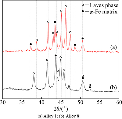 图2所示为合金1和8退火组织的XRD谱。实验证实其组织均为FCC+Laves相。从图2可发现,含4%Si的合金8与不含Si的合金1相比,Laves相的衍射峰向左发生了偏移,说明其成分发生了改变。随着合金中Si含量的增加,Mo与Si含量呈正相关性增长。由于合金中固溶了更多的原子半径较大的Mo,以及Si占据Laves相的间隙位置,导致点阵常数增加,使衍射峰左移。这与邹欣伟等[12]的研究相一致,许多二元Laves相可以固溶相当大的第三元素而不改变其本身的晶体结构,且Fe2Mo型的Laves相可以固溶第三元素。其他合金的XRD结果显示出相同规律。