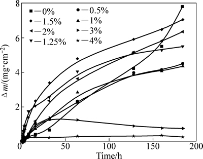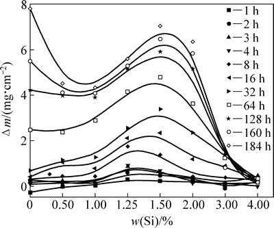 Fig. 4 Changing curves of mass increments with Si content during oxidation of alloys for different time