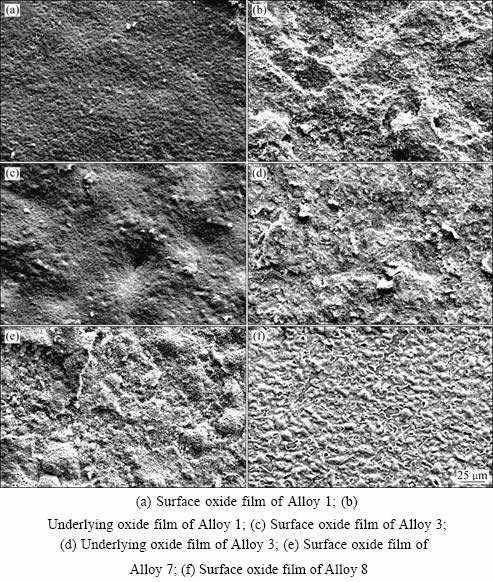 Fig. 5 Oxidation surface morphologies of alloys after static oxidation at 800 ℃ for 184 h:oxide film of Alloy 7