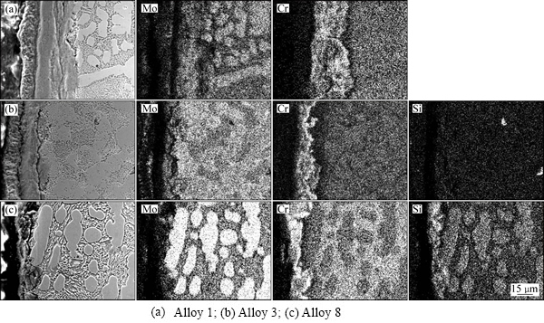图6所示为合金氧化后的截面组织和成分分布。由图6可知,合金中Si含量较低时,如合金1和3,表面氧化膜明显分为较为疏松的外层和较为致密的底层,而Si含量较高的合金8表面只有一层较薄的氧化层。从成分分布结果来看,Cr主要是富集在与基体结合紧密的内氧化层,说明在内氧化层中含Cr的氧化物为其主要成分之一。比较Mo在氧化层的分布发现,合金1中Mo富集在底层的外侧,且从底层到外层,Mo含量逐步减小;合金3的外层还可以看到少量Mo,但Mo在合金3底层外侧富集情况已经不明显;合金8的氧化层中已经没有Mo的富集。结果表明:随Si含量的增加,低熔点Mo的氧化物的挥发被逐渐抑制。由Si的分布情况可以发现,抗氧化性最佳的合金8的氧化层中富集了Si元素,而且在Laves相中也产生富集。元素面扫描分析结果与EDS分析结果是一致的。