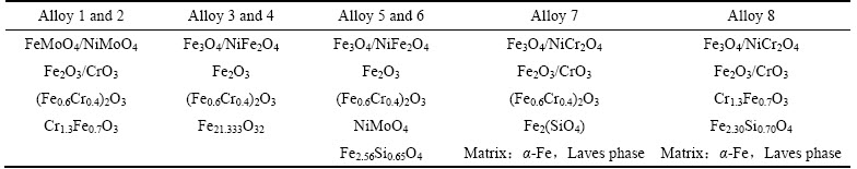 为进一步研究氧化过程,利用XRD对合金表面氧化物进行了物相鉴定,氧化物XRD谱如表3所示。合金1与2,3与4,5与6,7与8的氧化产物相似或相同。整体来看,氧化物中普遍存在Fe、Cr氧化物。合金1、2、5、6中出现了含Mo的氧化物。而合金3和4的氧化外层只有极少量脱落,XRD结果基本为最外层氧化物成分,由于高温下挥发而未出现Mo的氧化物,这与李正栋等[15]的研究结果相一致。Si含量达到1.5%后,出现了Fe、Si氧化物。由于合金7和8的氧化层较薄,故XRD谱中出现了基体的衍射峰。