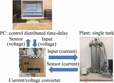 The configuration of the experimental system handled in this research is shown in Figure 2. DCS device takes on a role of the central monitoring room. In the personal computer, the sensor signal of the process is fed back via the PCI board (Interface Corporation, PCI-3521), and the control input is calculated, and the value is handled. Here, since the electrical signal handled by the personal computer is a voltage of 0-5 V and current handled by the process device is 4-20 mA, there is a signal conversion circuit between the personal computer and the process device. The signal converted from voltage to current is sent to the process by the signal conversion circuit. Distributed time-delay is generated in the interior of PC. Therefore, this research aims to compensate for the bad effect on the control system due to network time-delay.