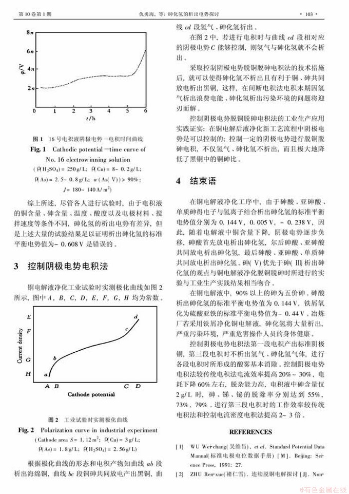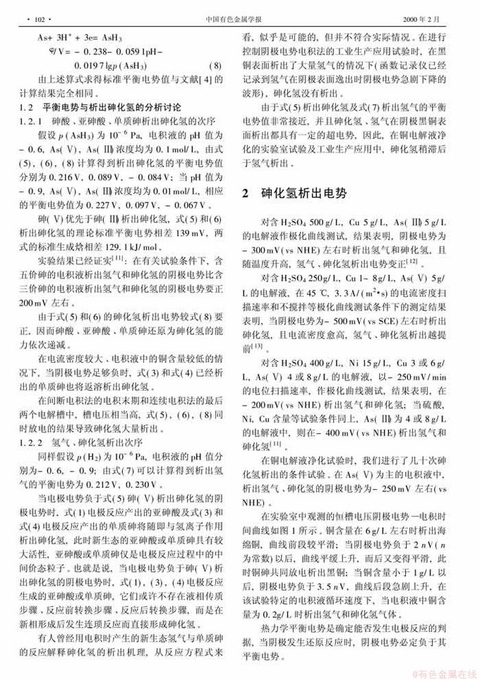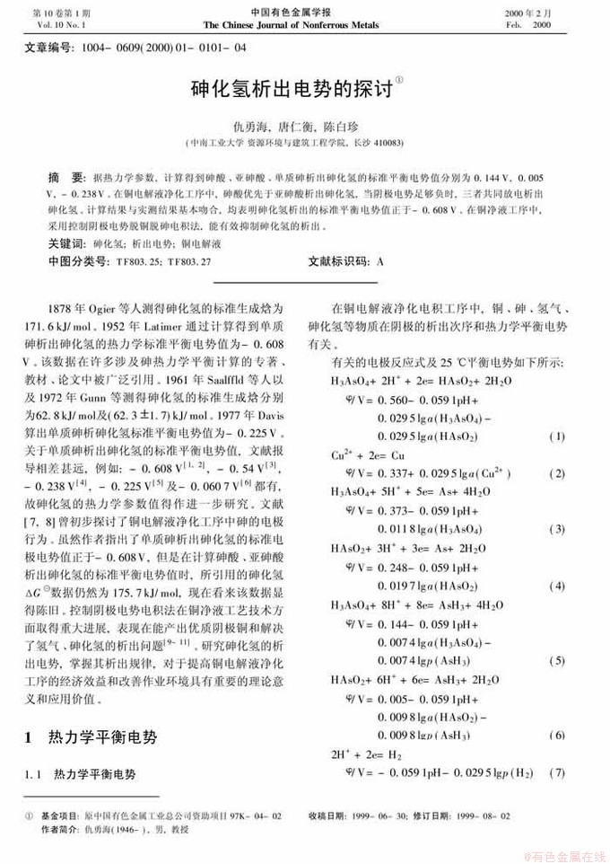 摘 要:据热力学参数,计算得到砷酸、亚砷酸、单质砷析出砷化氢的标准平衡电势值分别为0.144 V, 0.005V,-0.238 V。在铜电解液净化工序中,砷酸优先于亚砷酸析出砷化氢,当阴极电势足够负时,三者共同放电析出砷化氢。计算结果与实测结果基本吻合,均表明砷化氢析出的标准平衡电势值正于-0.608 V。在铜净液工序中,采用控制阴极电势脱铜脱砷电积法,能有效抑制砷化氢的析出。