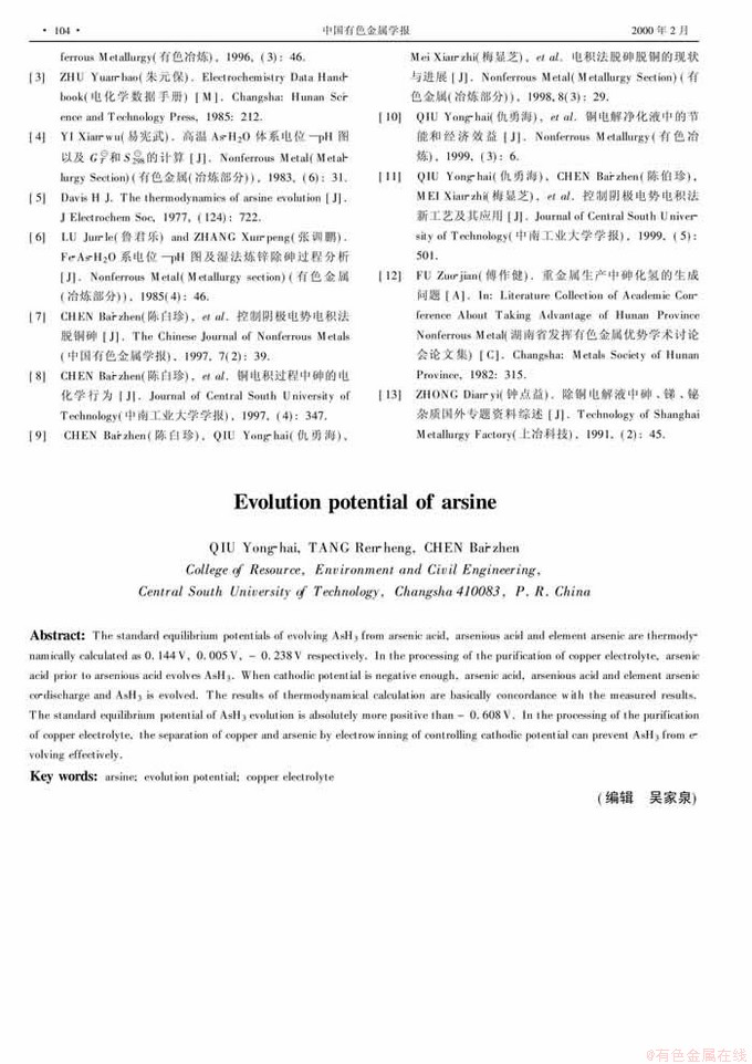 Abstract: The standard equilibrium potentials of evolving AsH3 from arsenic acid, arsenious acid and element arsenic are thermodynamically calculated as 0.144V, 0.005V, -0.238 V respectively. In the processing of the purification of copper electrolyte, arsenic acid prior to arsenious acid evolves AsH3. When cathodic potential is negative enough, arsenic acid, arsenious acid and element arsenic co-discharge and AsH3 is evolved. The results of thermodynamical calculation are basically concordance with the measured results. The standard equilibrium potential of AsH3 evolution is absolutely more positive than -0.608V. In the processing of the purification of copper electrolyte, the separation of copper and arsenic by electrowinning of controlling cathodic potential can prevent AsH3 from evolving effectively.