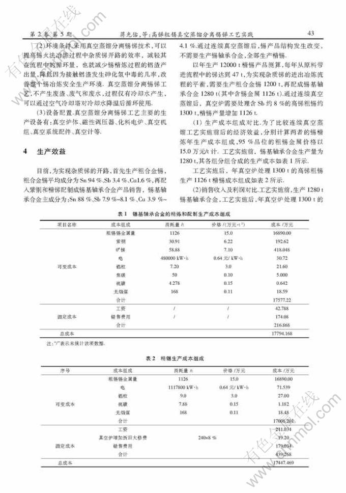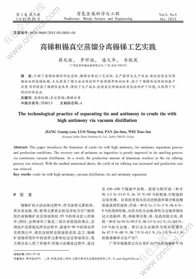 Key words:crude tin with high antimony; vacuum distillation; tin and antimony separation