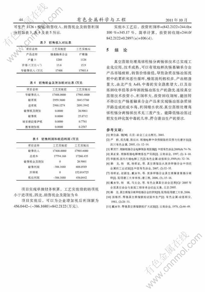 摘 要:介绍了高锑粗锡的形成过程、锡锑分离的工艺流程、生产条件及生产效益通过连续真空蒸馏法处理高锑粗锡,大大提高了锡火法冶炼过程中杂质锑开路的效率,减少了锡精炼过程的铝渣产出量同时提高了锡精炼直收率,降低了生产成本连续真空蒸馏法既有效地保护了环境,又取得了可观的经济效益。