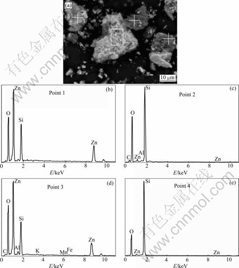 1) 通过对广西某地高硅氧化锌矿化学分析和扫描电镜能谱分析可知,矿物中锌的主要物相为硅酸盐类矿物,即为硅锌矿Zn2SiO4和异极矿Zn4(Si2O7)- (OH)2·H2O,还有大量的SiO2和钙镁等碱性脉石。